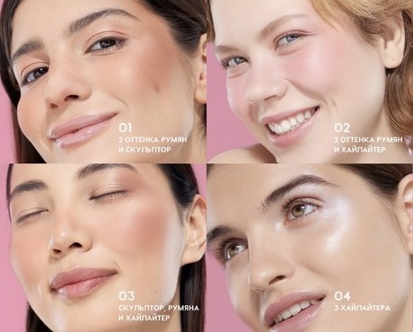 Способ применения: С помощью кисти нанеси румяна на щеки или скулы, а скульптор — под скулы и на боковые стороны лба.