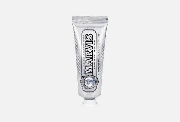 Зубная паста "Мята Антитабак" содержит особый полимер Plasdone™K-29/32, предотвращающий возникновение пятен на эмали. Этот компонент позволяет устранять с поверхности зуба вещества с красящей активностью (например, полифенолы кофе, чая, вина…). В Marvis выбрали такой полимер, потому что он сохраняет белизну эмали без использования перекиси водорода и чрезмерно абразивных агентов.